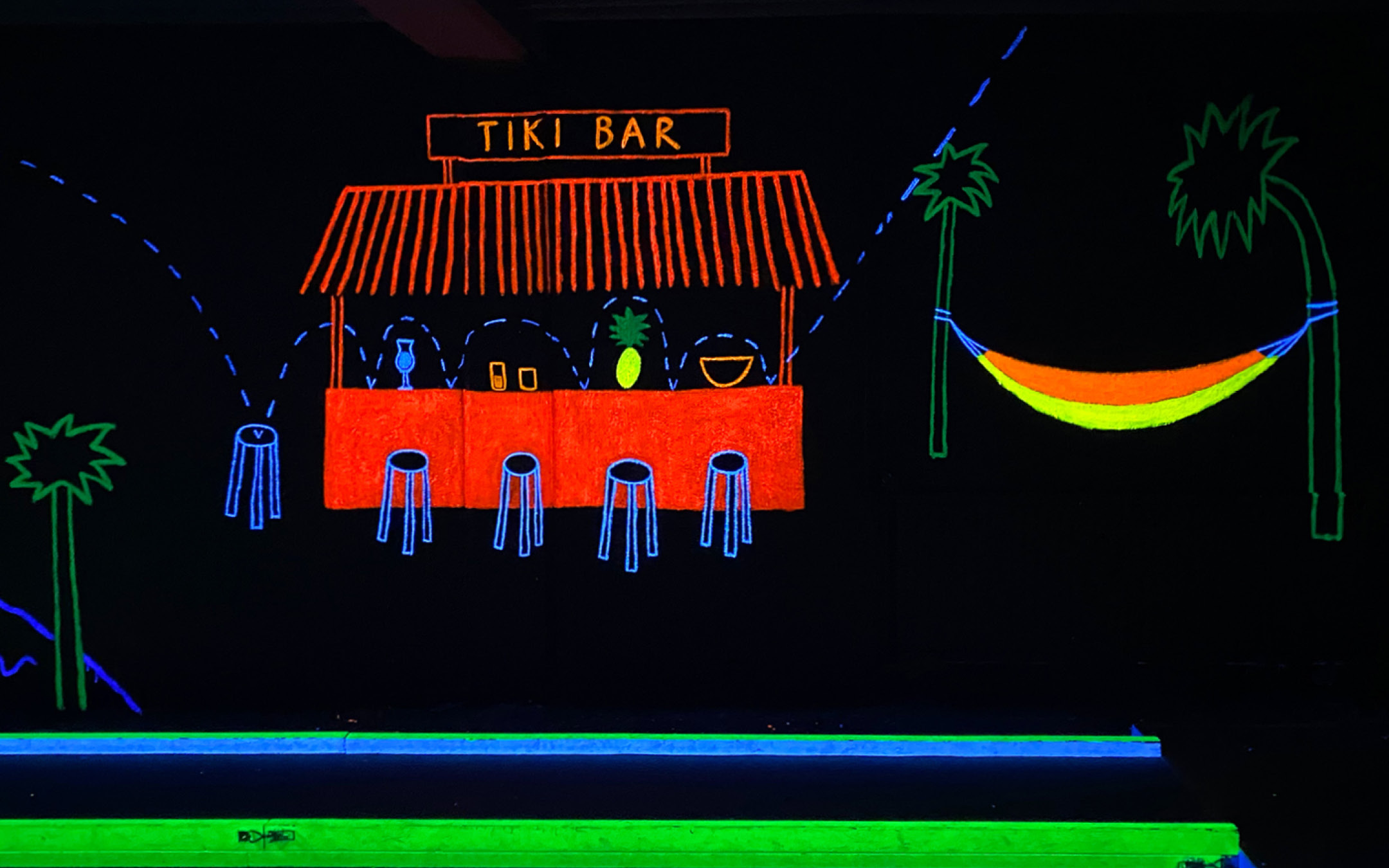 Follow the vibrant and unexpected journey of two golf balls as they travel through tiki-inspired environments, whilst playing minigolf. Mural painting in UV light, commissioned by Tiki Bar Grill / Multi Challenge Östersund.