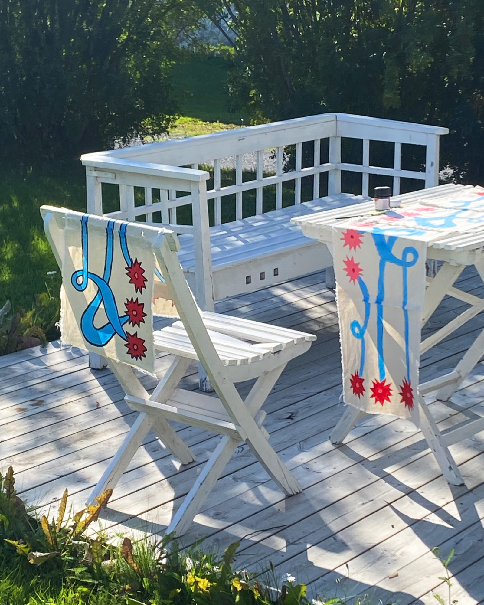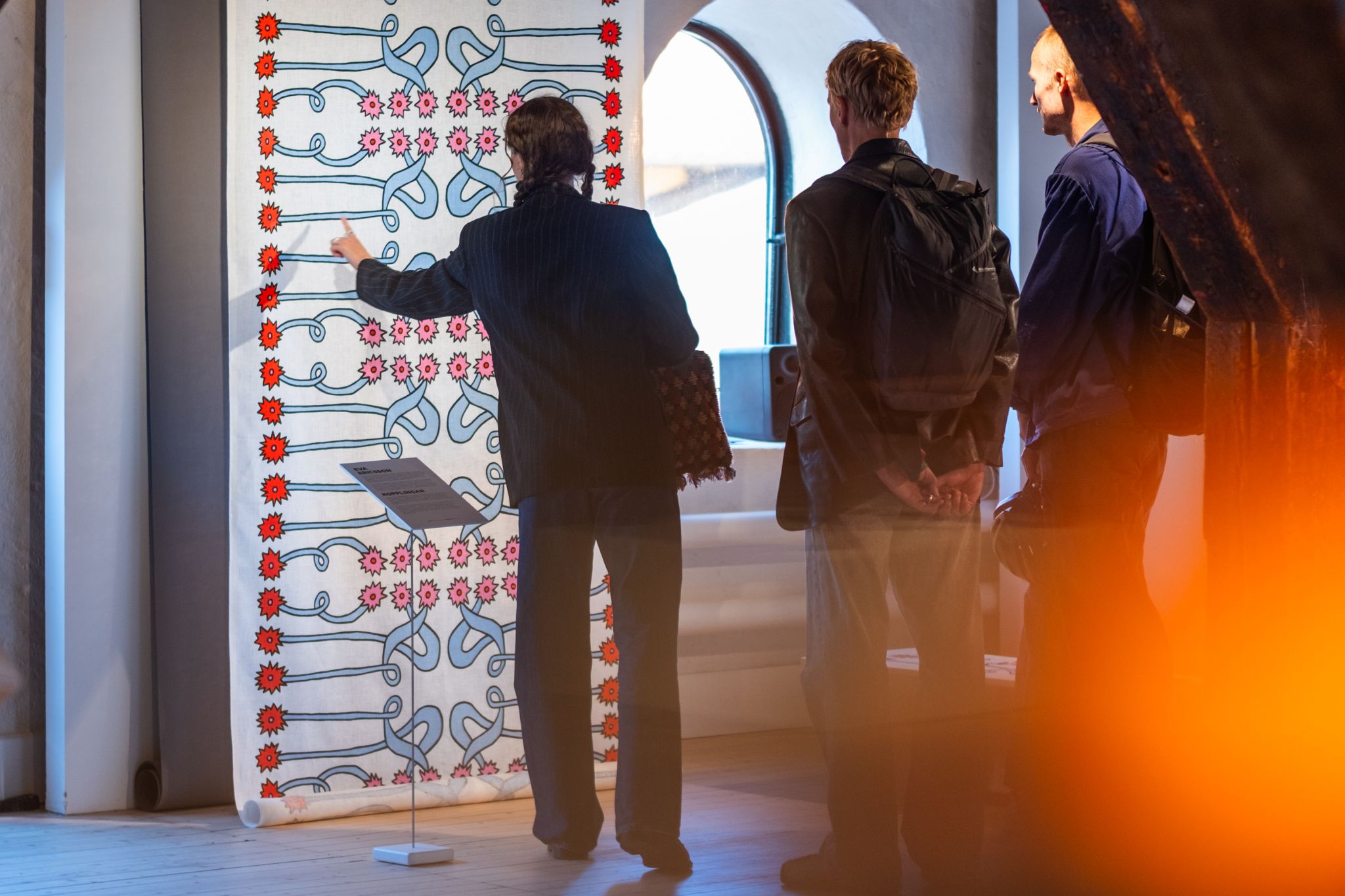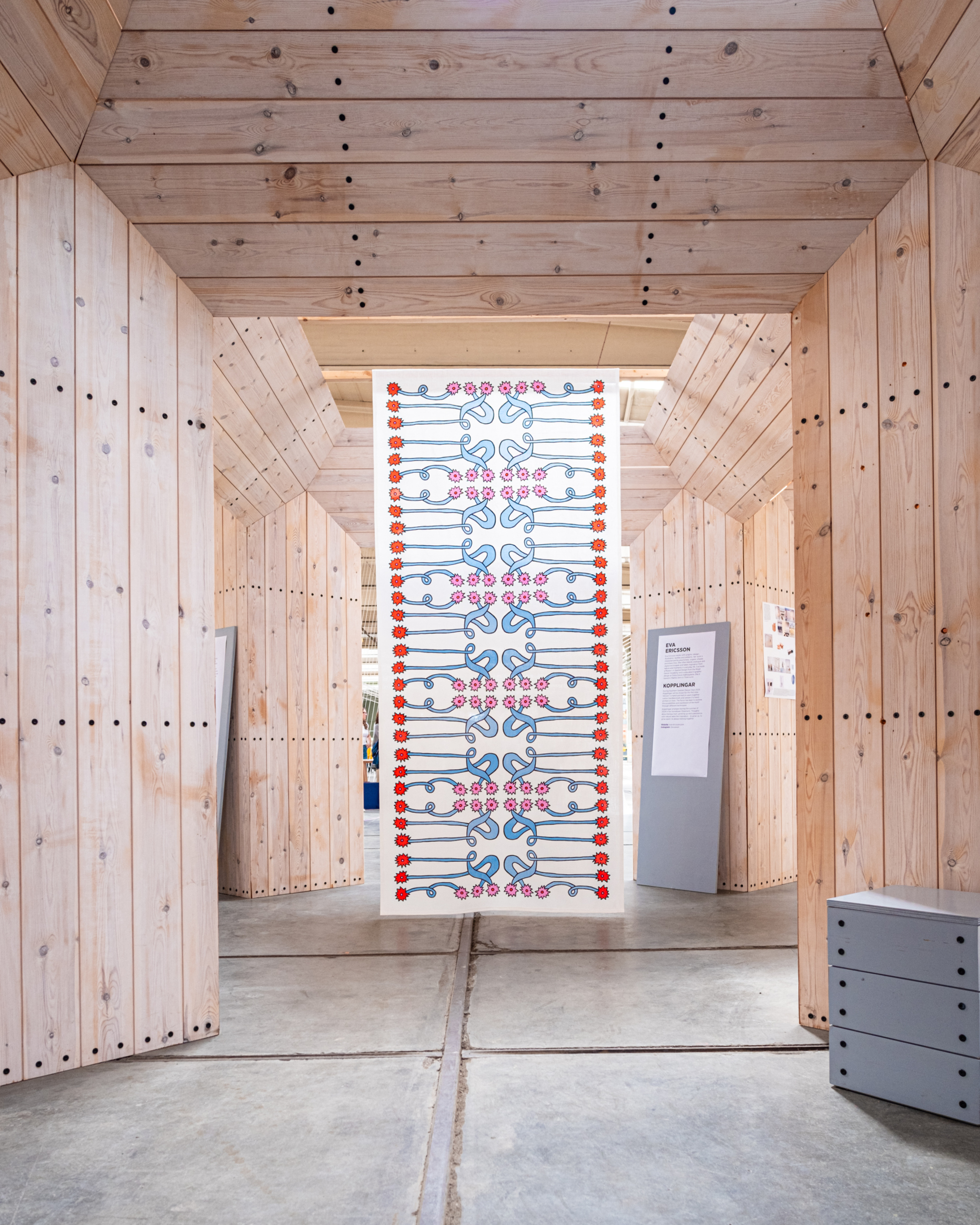 By sewing together and painting on reused cotton napkins which could be turned, twisted, removed, and added – a pattern slowly emerged. The pattern is about growing up, being a twin and coexisting with nature – to grow up, to grow apart, to always belong together. Screen printed on linen, hand-painted on cotton. Photo 1,3 & 4: Daniel Engvall.