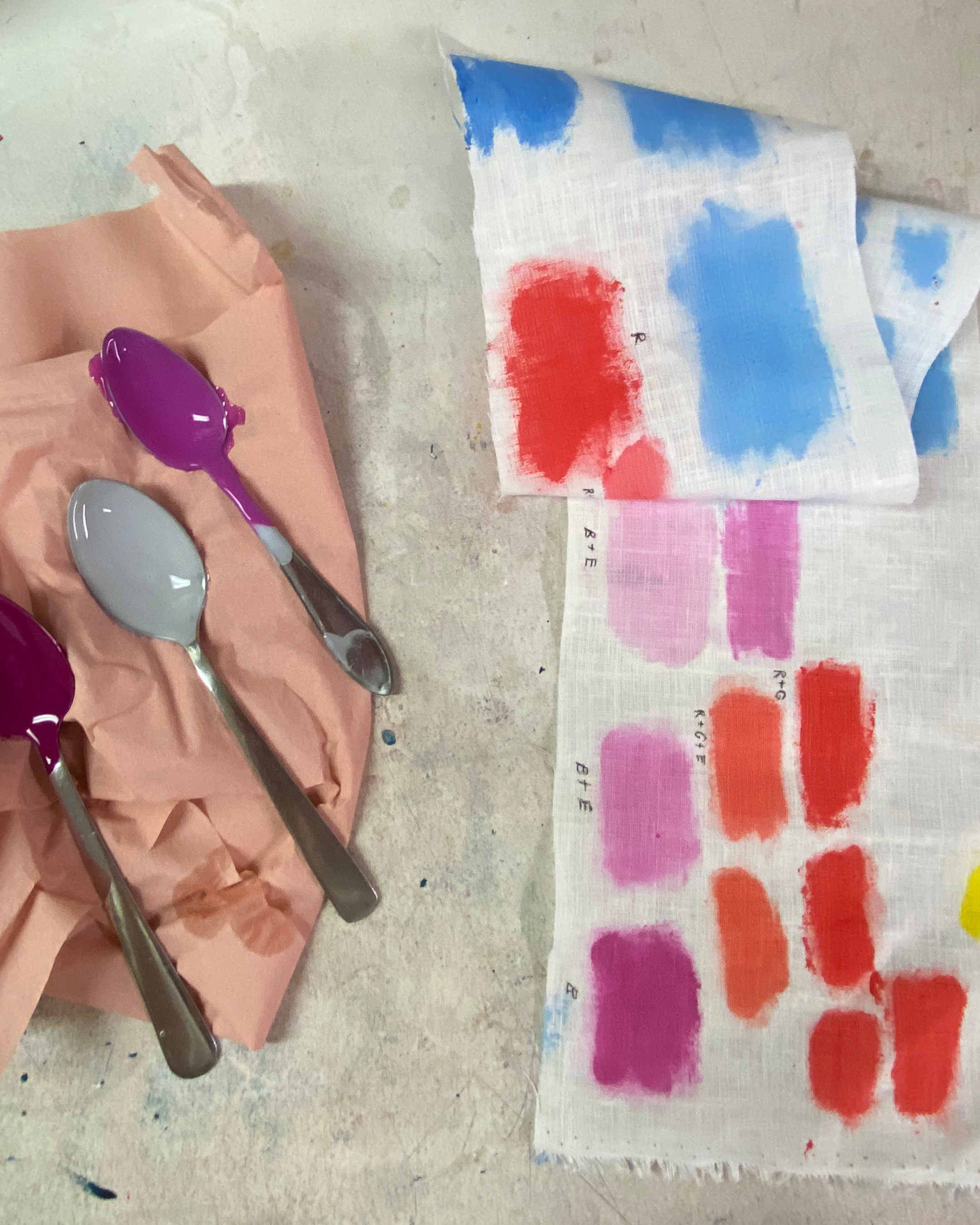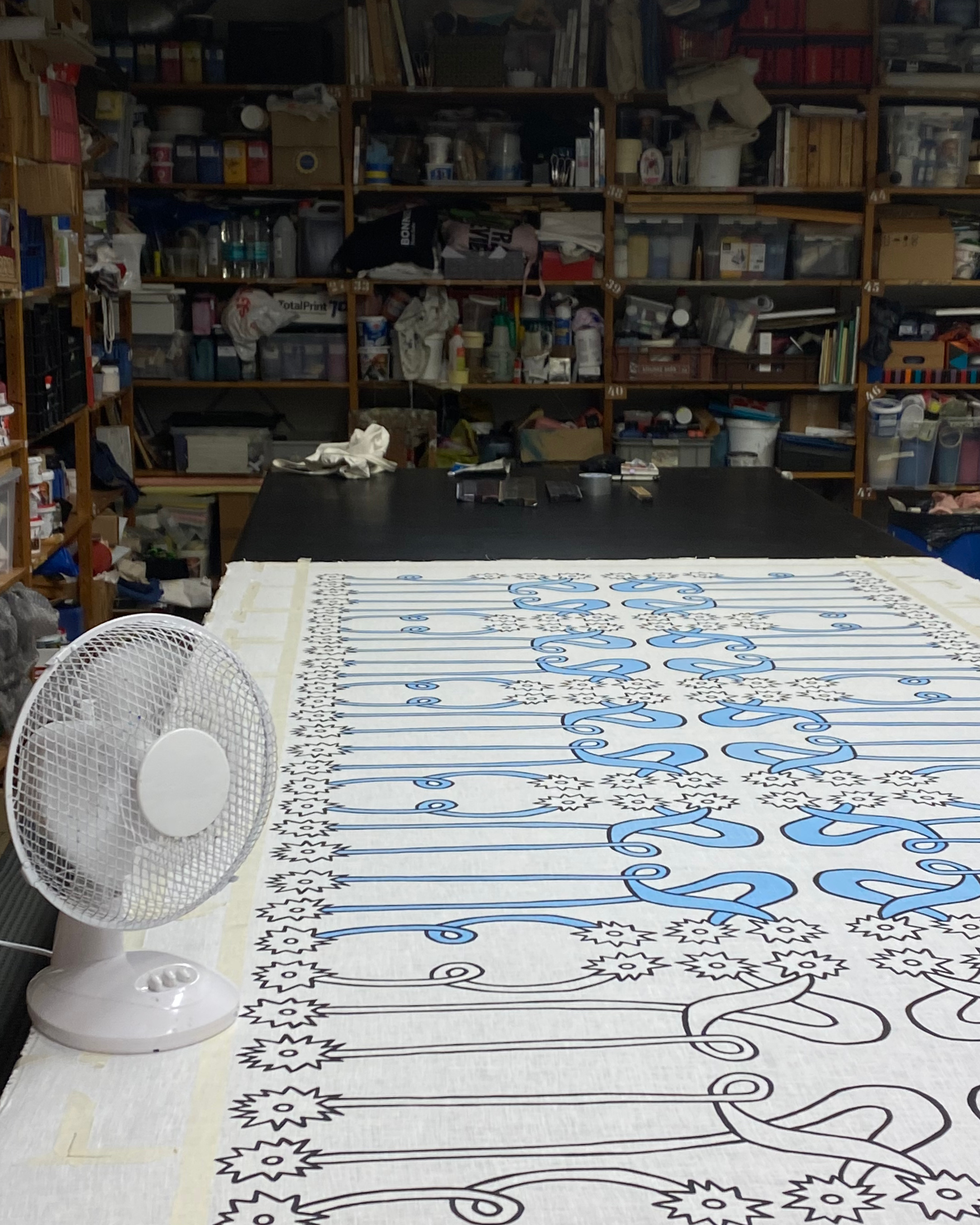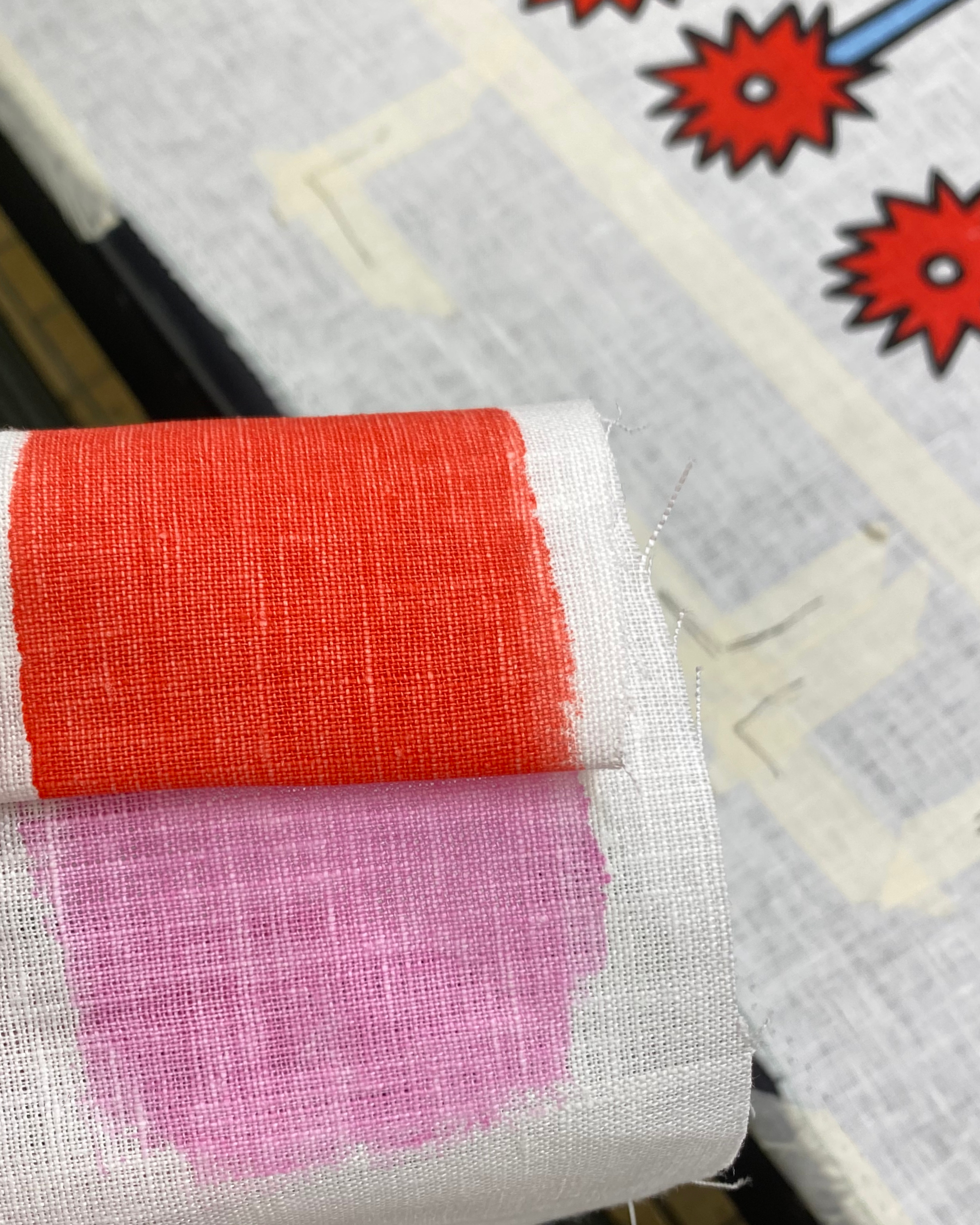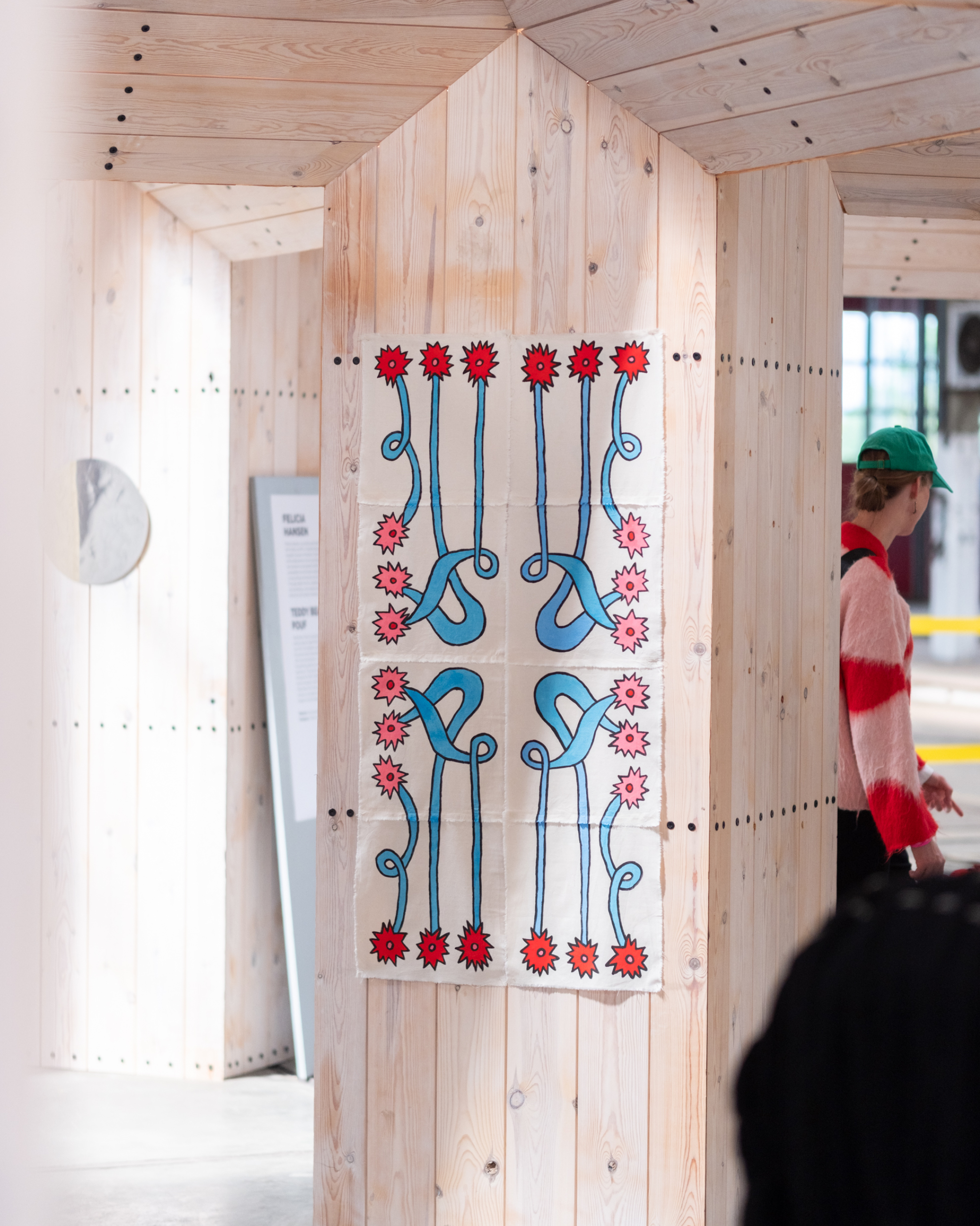 By sewing together and painting on reused cotton napkins which could be turned, twisted, removed, and added – a pattern slowly emerged. The pattern is about growing up, being a twin and coexisting with nature – to grow up, to grow apart, to always belong together. Screen printed on linen, hand-painted on cotton. Photo 1,3 & 4: Daniel Engvall.
