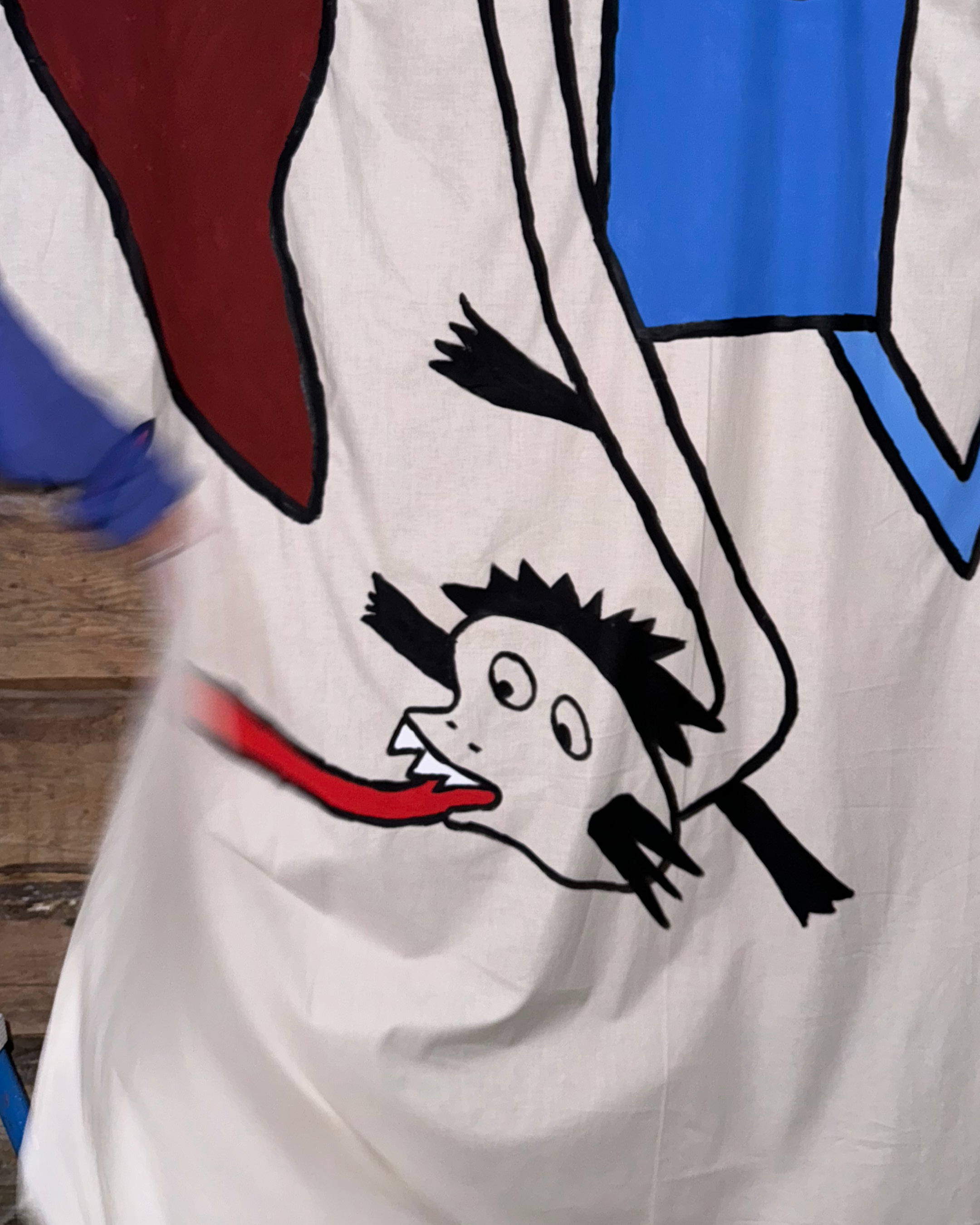 ‘Oppi orra’ means happy and lively on Jämtska – a good description of this hand-painted backdrop that set the mood in an old barn. Dimensions: 2x 150x350 cm.